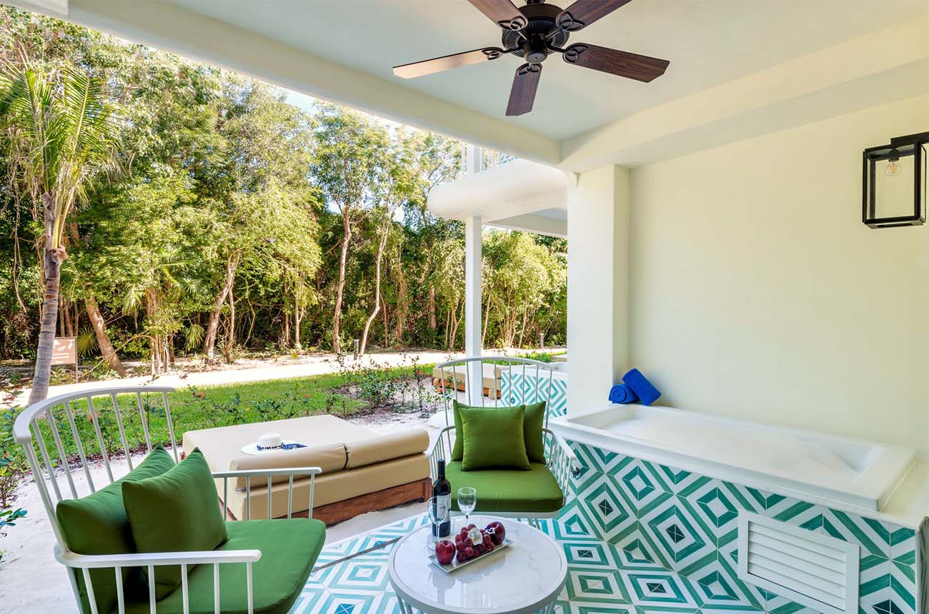 ​Luxurious suite located in front of the ocean, ideal to relax on its terrace with lounge chairs. Its areas include a separate bedroom and a living room with a sitting area. Maximum capacity 3 people.