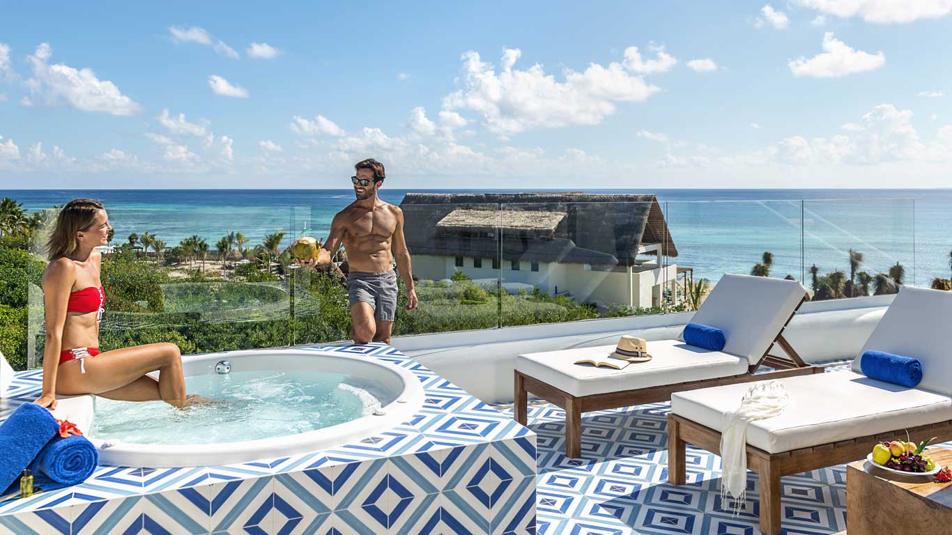 Ocean Riviera ParadiseLuxurious suite located in front of the ocean, ideal to relax on its terrace with lounge chairs. Its areas include a separate bedroom and a living room with a sitting area. Maximum capacity 3 people.